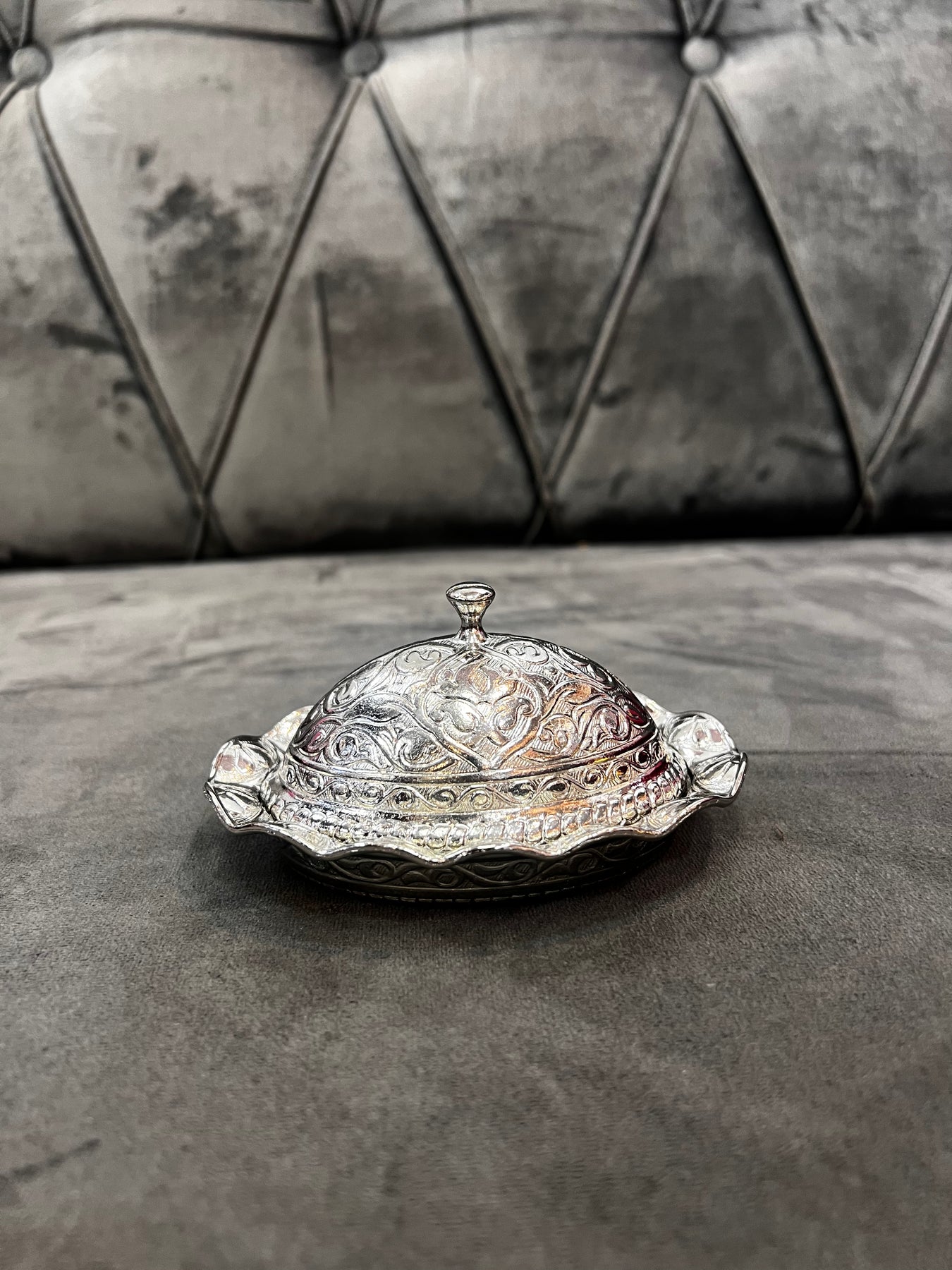 Elegant metal sugar holder with metal design detailing around the side and top lid and sides of the sugar pot.